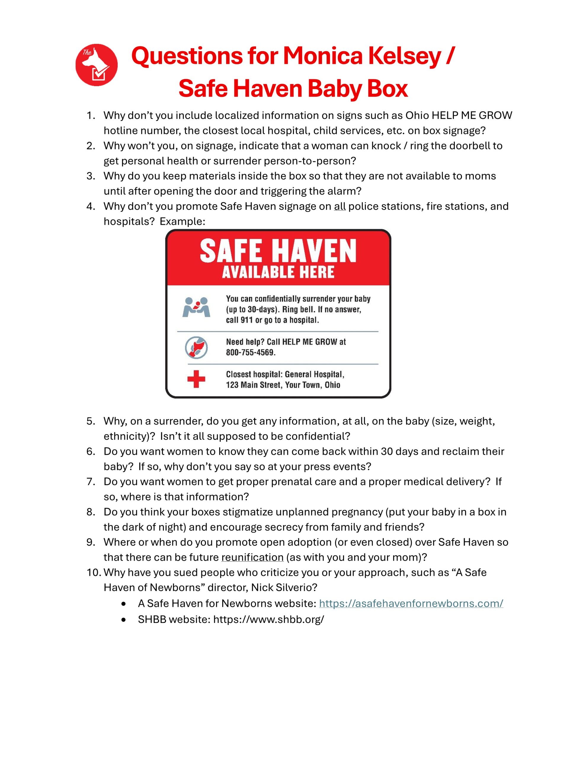 Below is the list of questions political watchdog Chris Hicks attempted to ask SHBB Inc CEO/Founder Monica Kelsey at last week’s baby box opening in Hamilton, Ohio. Instead of being professional and answering them or politely declining, she called for Security and ran away. Each question is reasonable and something that a member of any legislature might ask–and in some cases has asked. Did she run out of the hearing room? Call for the state patrol?